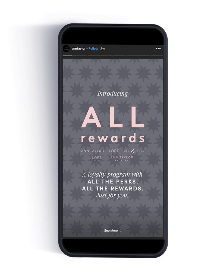 The goal at launch was pure enrollment. To grab the interest of as many current ANN INC. customers as possible, we implemented a robust awareness campaign across all channels: stores, eCommerce site, organic and paid social media, email, digital media and PR. The message was simple: get rewarded for free, on your terms.